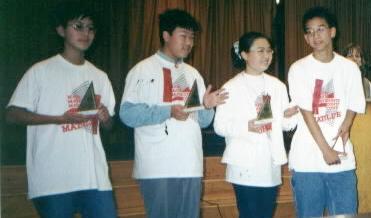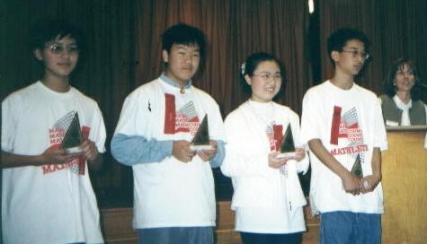 INDIVIDUAL TROPHIES WENT TO TWO TEAM MEMBERS FROM SUZANNE MIDDLE SCHOOL: ANGELA SUN FOR PLACING FIFTH AND JASON WANG FOR PLACING TENTH. ANGELA AND JASON ALSO RECEIVED A TEAM TROPHY ALONG WITH TEAM MEMBERS DUC DO AND ANTHONY LU FOR THEIR SECOND PLACE STANDING IN THE TEAM COMPETITION.