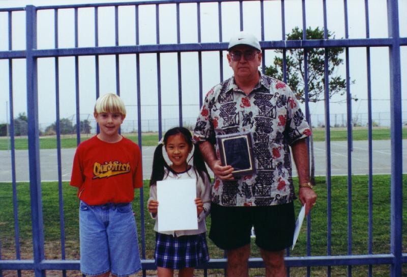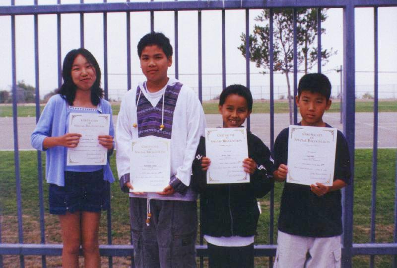 AFTER THE LUNCH PERIOD, MRS. LUZAK ANNOUNCED THE WINNING TEAMS FOR THIS YEAR'S WALNUT VALLEY UNIFIED SCHOOL DISTRICT'S MATH FIELD DAY. THE WINNING TEAMS WERE PRESENTED WITH A PLAQUE FOR THEIR SCHOOL AND A GOLD-BORDERED CERTIFICATE FOR EACH OF THE WINNING TEAM MEMBERS. THE WINNING TEAM MEMBERS FOR THE 4TH GRADE FROM COLLEGEWOOD ELEMENTARY ARE DONNIE THOMPSON, SARA WANG, DAVID CHEN, AND MICHAEL LUCERO. THE 5TH GRADE WINNING TEAM FROM EVERGREEN ELEMENTARY ARE JENNIFER KIM, BRANDON CHAU, ANDY KOE, AND SAM KIM. THE 6TH GRADE WINNING TEAM FROM CHAPARRAL MIDDLE SCHOOL CONSISTS OF SHARON KUO, TIFFANY MA, KRISTINE SARNLERTSOPHON, AND OBY OWU. THE 7TH GRADE WINNERS FROM SUZANNE MIDDLE SCHOOL ARE DENTON LI, BRIAN WU, MARCUS LEUNG, AND SHAWN YANG. THE 8TH GRADE WINNERS, ALSO FROM SUZANNE MIDDLE SCHOOL, ARE EVA CHENG, MATT GUNAWAN, MICHAEL LIN, AND JONATHAN LU. IN ADDITION, EACH OF STUDENTS WILL RECEIVE A CERTIFICATE OF PARTICIPATION.