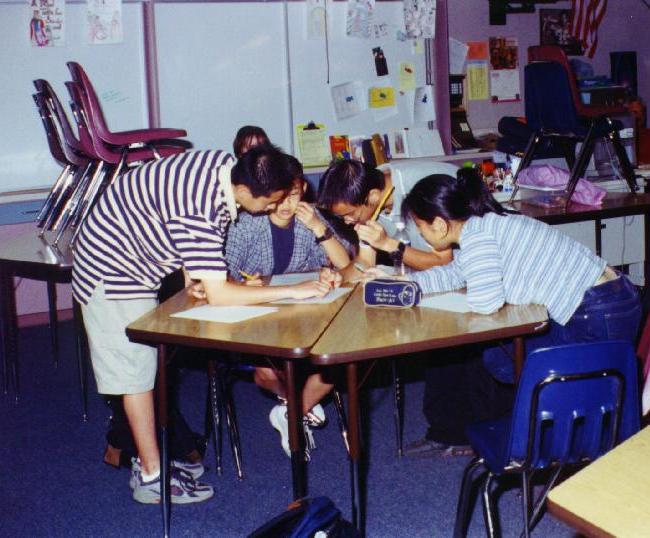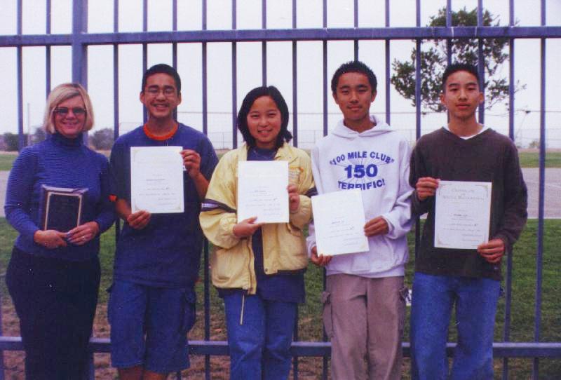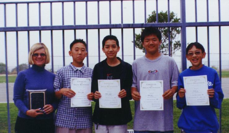 (l-r) Mrs. J. Arlotti, Suzanne Middle School Teacher, Matt Gunawan, Eva Cheng, Anthony Lu, and Michael Lin.