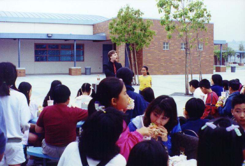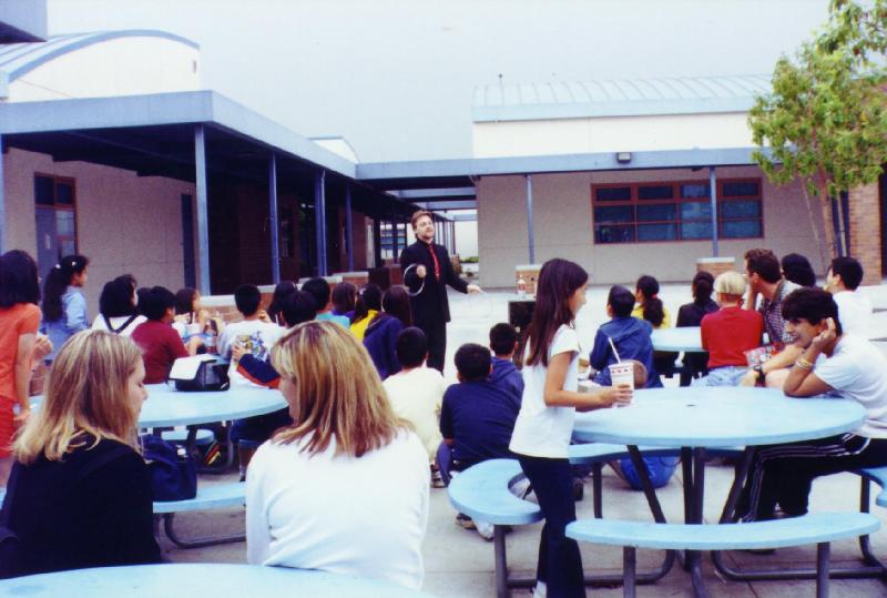AFTER THE RIGORS OF THE FAST-PACED MORNING COMPETITION, THE STUDENTS AND ADULTS WERE TREATED TO THE SHOWMANSHIP OF MAGICIAN MR. BRYAN STOOPS WHILE THEY ENJOYED THEIR PRE-PAID LUNCH FROM THE 'IN-N-OUT" LUNCH TRUCK.